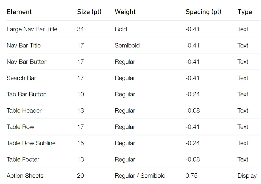iOS的字体大小有其比较明确的规范,具体查看下表: