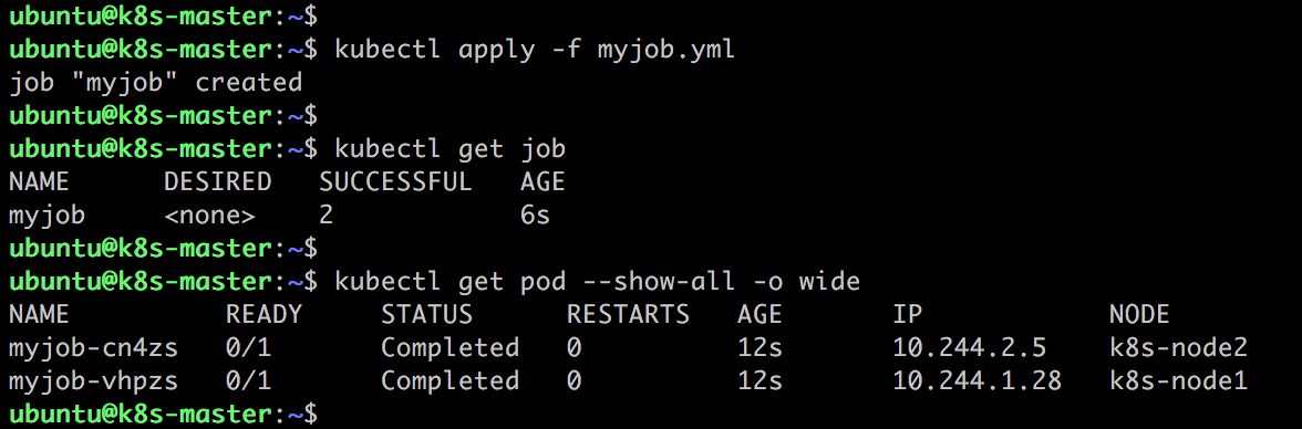 Job 一共启动了两个 Pod,而且 AGE 相同,可见是并行运行的。