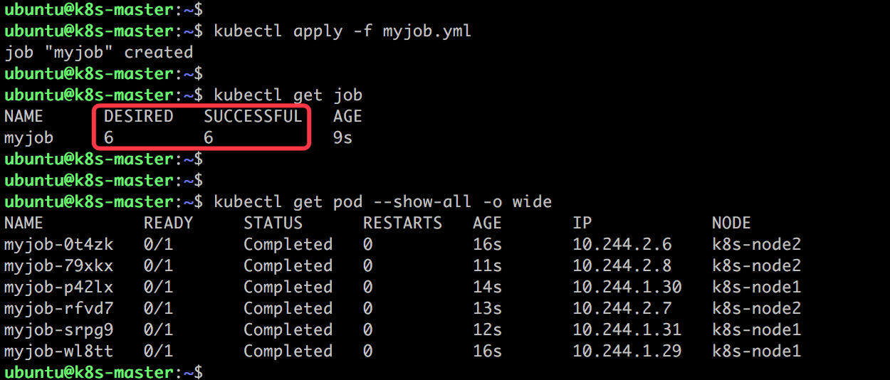 DESIRED 和 SUCCESSFUL 均为 6,符合预期。如果不指定 completions 和 parallelism,默认值均为 1。