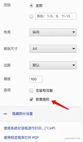 cmd+p/ctrl+p,先初步看看效果,记得要勾上选项里面的背景图形。mac下用谷歌甚至可以点击使用预览程序打开PDF直接看生成的pdf效果
