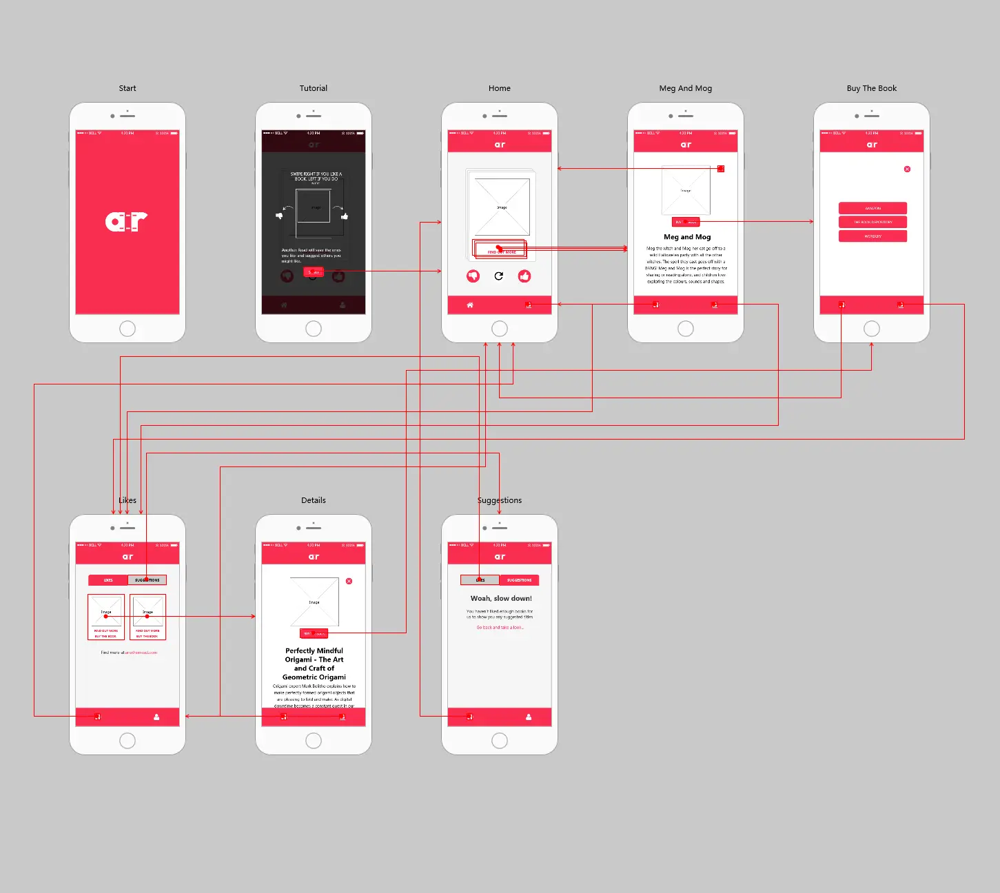 这个原型的主要页面有:启动页面、教程页面、主页、详情页面、收藏页面等。