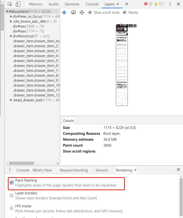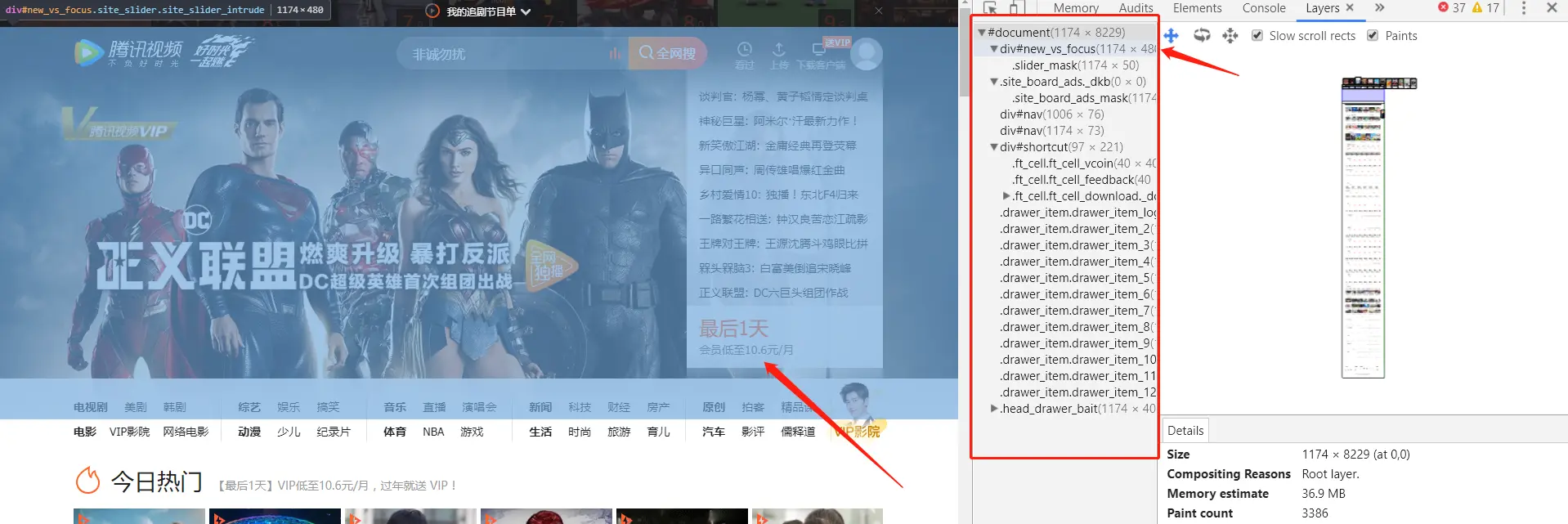 大体思路就是我们把频繁重绘回流的DOM元素作为一个图层,那么这个DOM元素的重绘和回流的影响只会在这个图层中,来提升性能。举个栗子,我们打开chrome开发者工具中的Layers,然后打开某网站