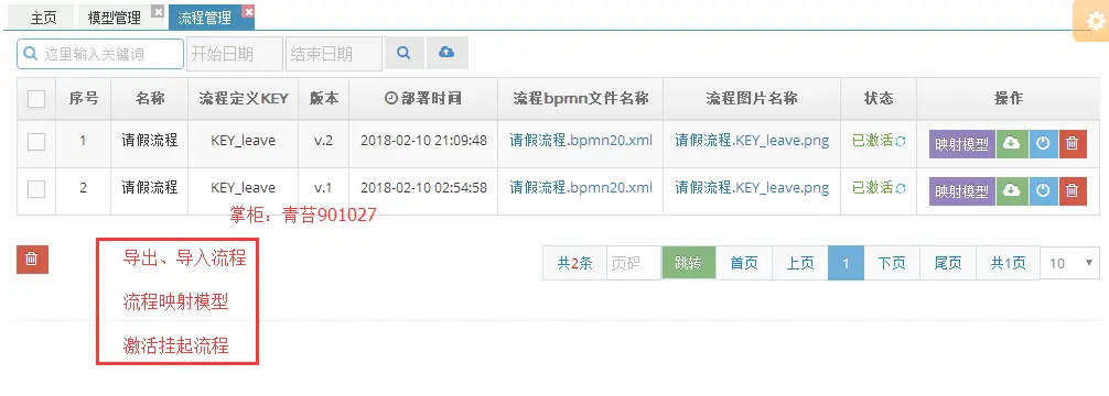 2.流程管理 :导入导出流程资源文件、查看流程图、根据流程实例反射出流程模型、激活挂起