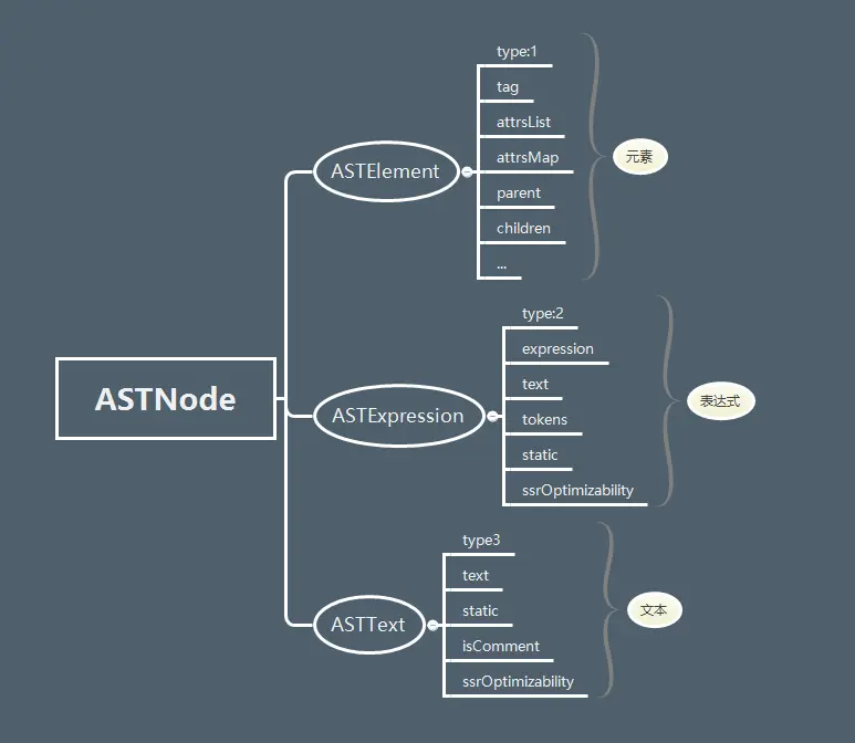 在 Vue 中,ASTNode 分几种不同类型,关于 ASTNode 的定义在 flow/compile.js 里面,请看下图: