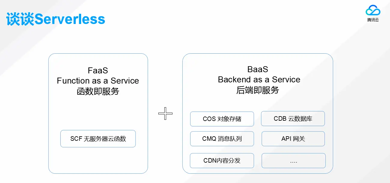 - 一是Backend as a Service,后端即服务,腾讯云上目前已经提供很多这类产品,例如COS对象存储、CMQ消息队列、CDN内容分发、CDB云数据库、API网关,这些产品更多的是承载数据的存储。