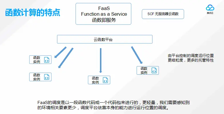 因为函数本身是托管型的,用户本身无法感知到实例在哪里运行。云函数平台背后有个大的计算资源池,用户实例触发之后,我们会从资源池中随机选取可运行的位置,把用户的函数实例在对应位置上跑起来。因此整个调度过程,或者事件来临之后的函数扩缩容过程,都是由平台进行的。对用户来说,调度的粒度更细了,而且调度也都托管给平台了。