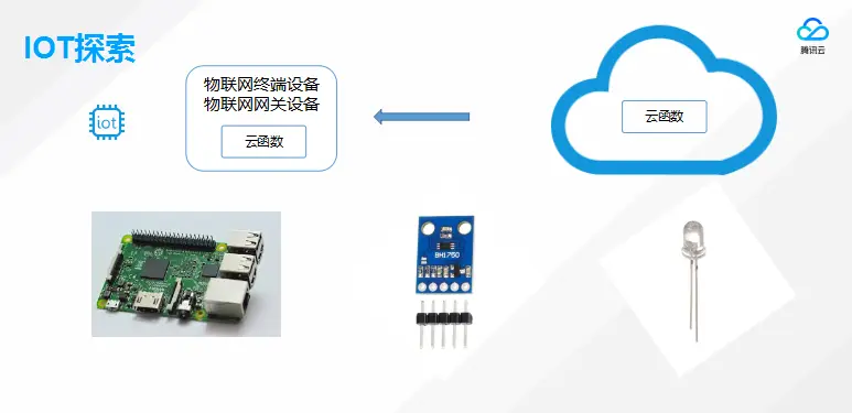 先简单介绍一下几款设备,第一个是树莓派,熟悉物联网的同学一般都了解;第二个是光感的传感器,可以感测环境光,从中读取到环境光的流明值;第三个是LED灯。