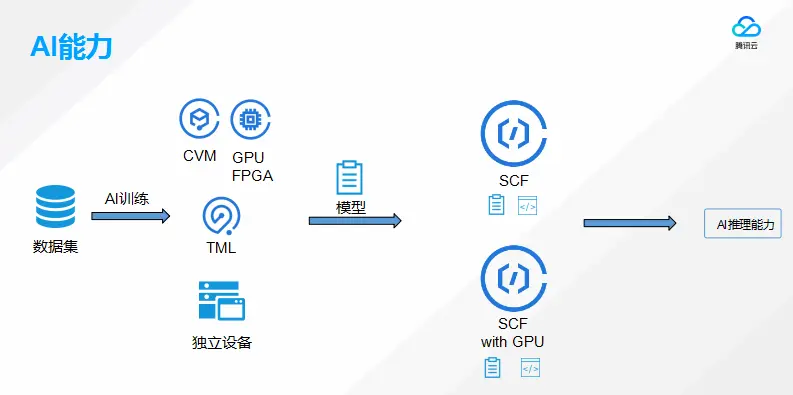 接下来讲的是目前云函数和用户协同推进的AI能力,用户数据只要在云上利用CVM、GPU服务器、腾讯TML机器学习,进行AI训练,得出相应的训练后模型,再把模型和外围的导入代码进行打包,放入云函数,或者是带有GPU的云函数,就可以对外提供AI的推理能力。用户真正使用AI的时候,从外面送过来一段用户需要推理的语音、文本或图像,在云函数中拉起训练模型,就可以对这段数据进行推理。