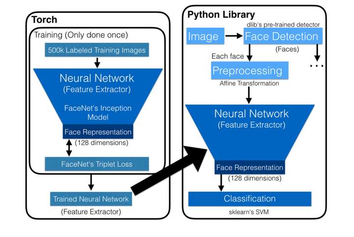 神经网络通过Torch,网络结构和Google的FaceNet结构相同。因为最后我们的目的不是训练分类模型,因此我们关注的重点主要还是在前两个功能,即人脸发现和特征提取。