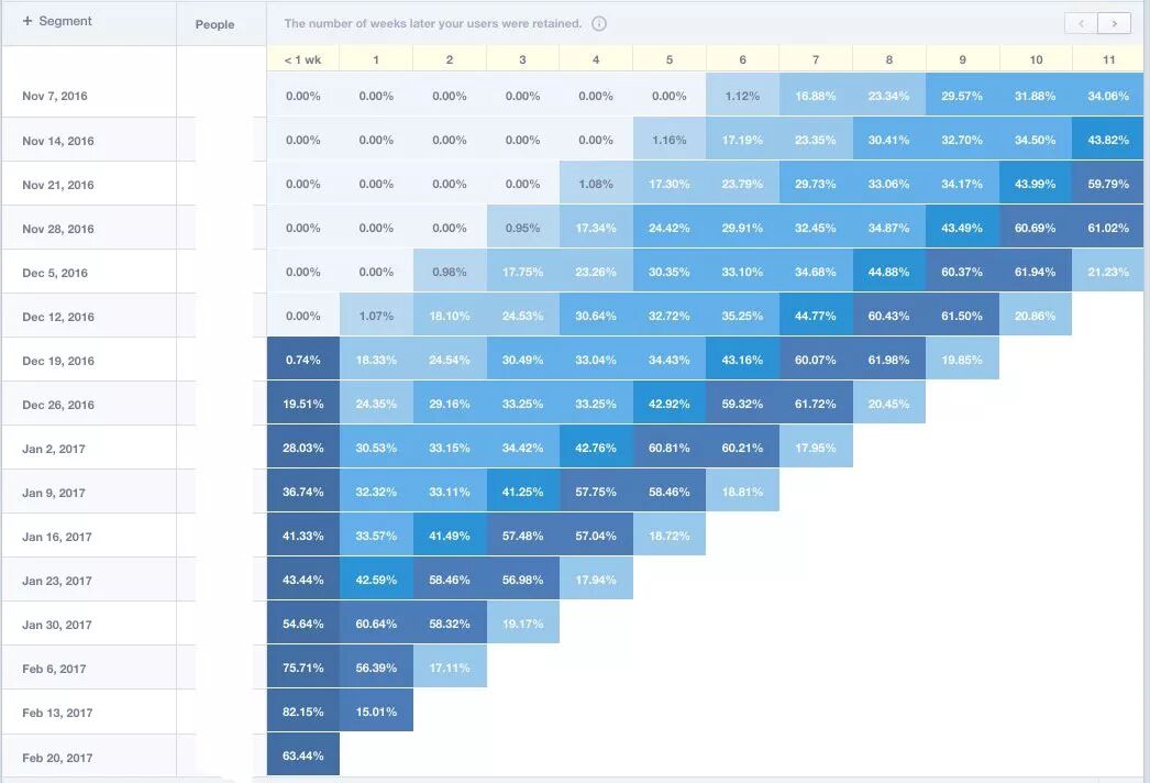 利用用户行为确定留存手段(在这里我们是用的是Mixpanel)。我们不仅对用户的行为进行管理,而且还对他们接收到的价值进行管理。对于像Chicisimo这样的APP来说,很难将其概念化。我们认为,将人们接收到的具体可测的价值进行衡量,并对这些事件进行群体分析,然后对收到的价值进行迭代,而不仅仅是对用户的操作进行迭代。我们还定义并删除了反杠杆(anti-levers)(分散主值的噪音),并获得了不同时间段所有相关标准:第一次会话、第一天、第一周等。这些特定标准帮助我们产品进行迭代。