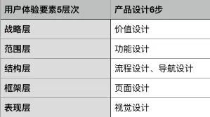 在《用户体验要素》这本书中,作者把面向用户体验的设计分为5个层次:战略层、范围层、结构层、框架层、表现层,可以与设计的6步骤相互对照。