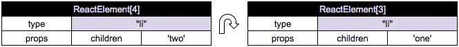 and the recursive ReactReconciler.receiveComponent() does not incur any DOM operations by comparing nodes (key: one and two) with same content , and only the necessary DOM operation, i.e.,