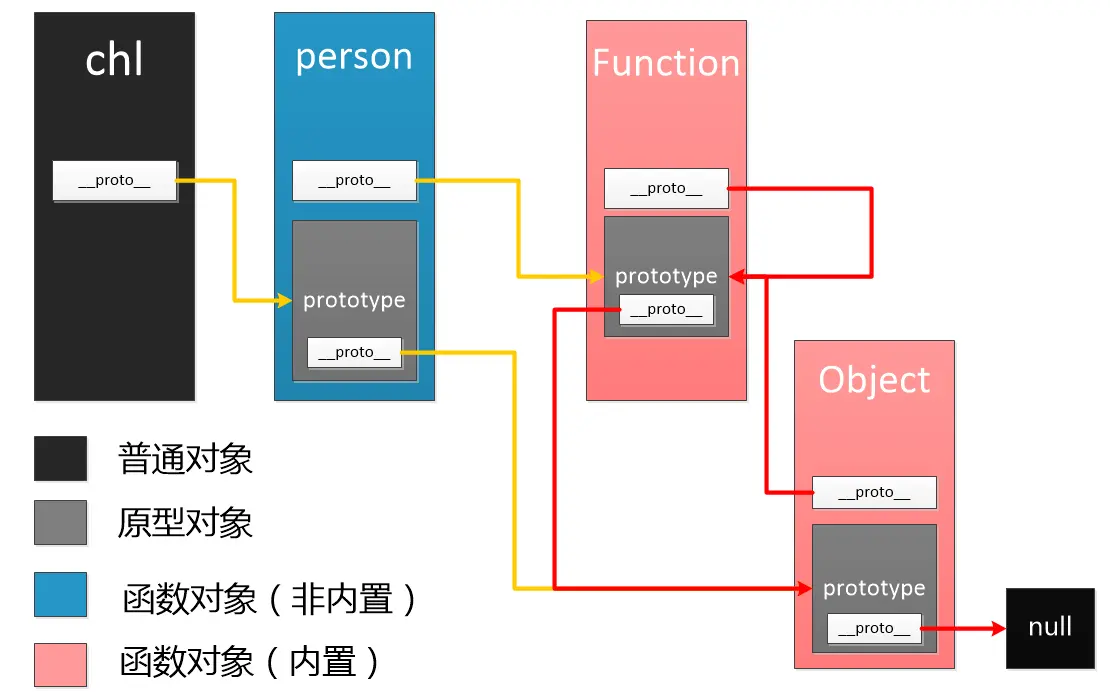 对象通过__proto__来连接原型对象prototype,也通过__proto__来进行原型链上的属性查找,直到原型链的末端:Object.prototype.__proto__–>null。
