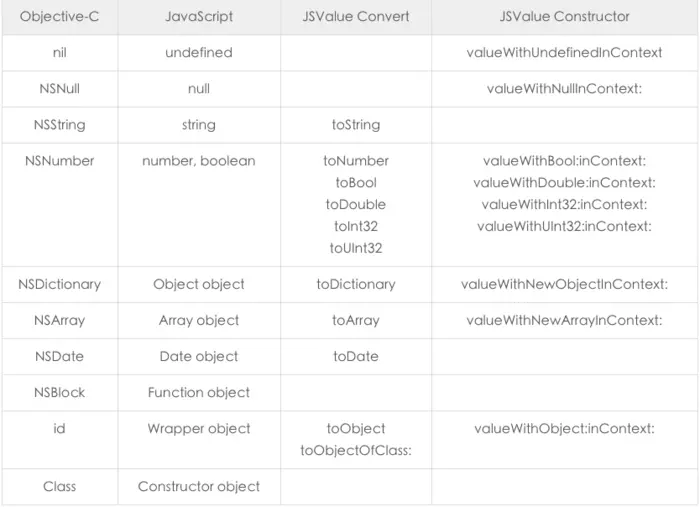 上述两篇文章中均有OC、JSValue、JavaScript的类型对应关系表。