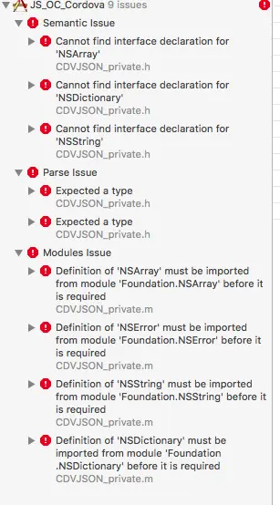 原因是Cordova 部分类中,并没有#import <Foundation/Foundation.h>,但是它们却使用了这个库里的NSArray、NSString 等类型。
