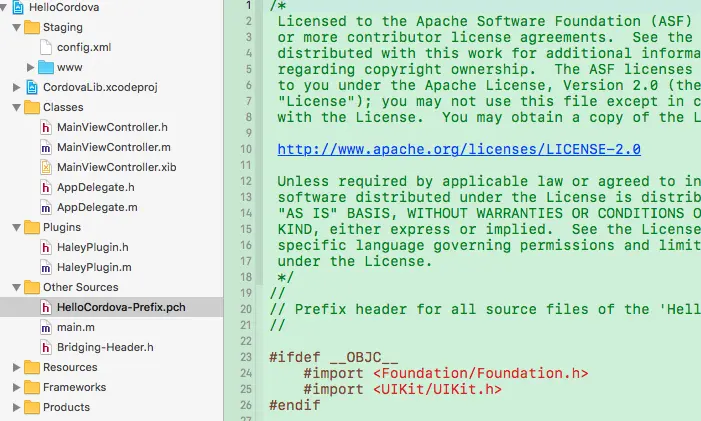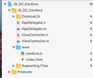 我这里用Xcode 8 新建了一个工程,叫 JS_OC_Cordova,然后将Cordova关键类添加进工程。
