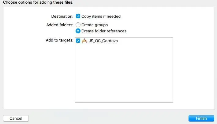 这里把www添加进工程时,需要注意勾选的是create foler references,创建的是蓝色文件夹。