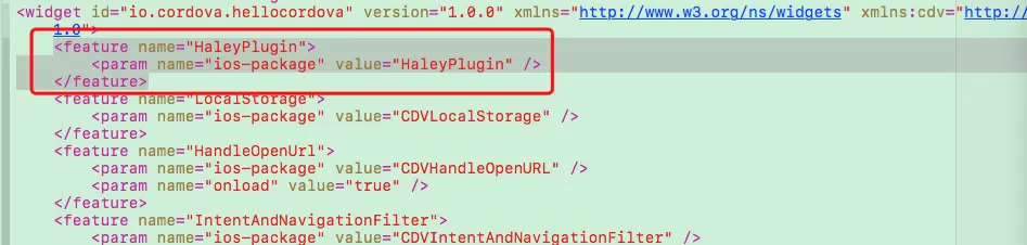 配置插件,是在config.xml的widget中添加自己创建的插件。