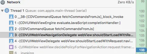 我搜索webView:shouldStartLoadWIthRequest:navigationType 方法,然后打上断点,看如下的堆栈调用:
