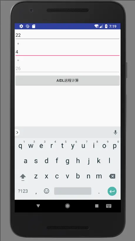 本篇目的是本地通过aidl调用远程service服务,计算传入的两个数值的和并返回的例子,初步掌握AIDL的使用。 闲话少说,先上效果图