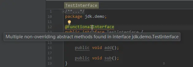 如果一个接口中包含不止一个抽象方法,那么不能使用@FunctionalInterface,编译会报错。