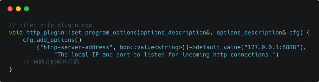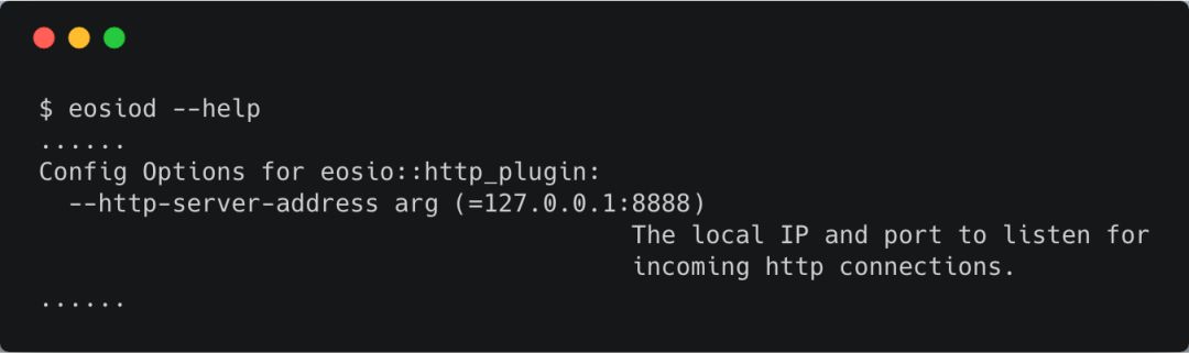 上面代码为http_plugin提供了外部参数 http-server-address,该参数既可以通过命令行获取(由plugin_cli_opts和 plugin_cfg_opts两个变量控制),又可以通过配置文件获取(由plugin_cfg_opts控制),于是,当你在命令行输入 eosiod --help时,会输出以下信息
