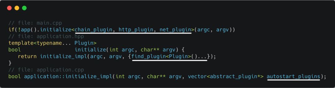 可以看到初始化是由initialize_impl这个函数实现的,这个函数接收命令行选项,和3个自动启动的插件作为参数—— chain_plugin、http_plugin和 net_plugin(我用白色的下划线做了标记)。