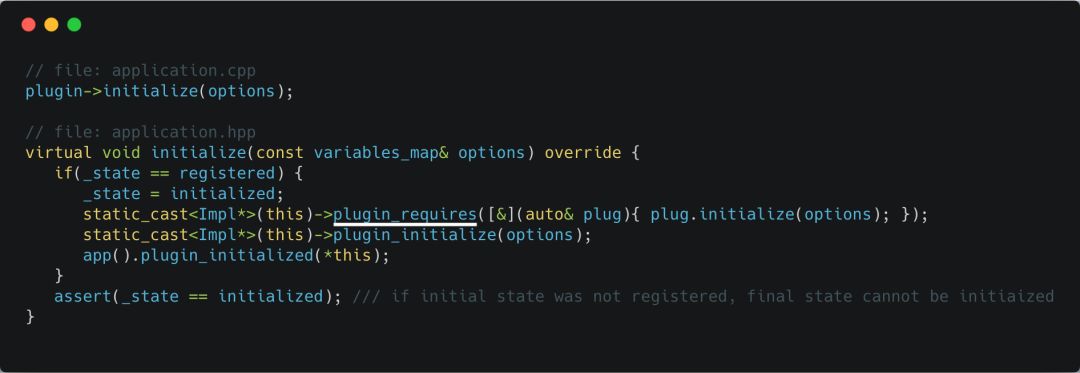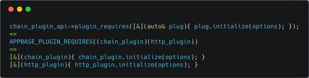 进入initialize函数,你发现了什么, plugin_requires这个函数是不是非常熟悉?没错,上文已经花了大量的篇幅来解释这个函数,但在初始化场景下有什么不同呢?细心的你应该发现了,差异在于Lambda表达式上,我们再次拿 chain_api_plugin这个插件举例,尝试对其进行展开