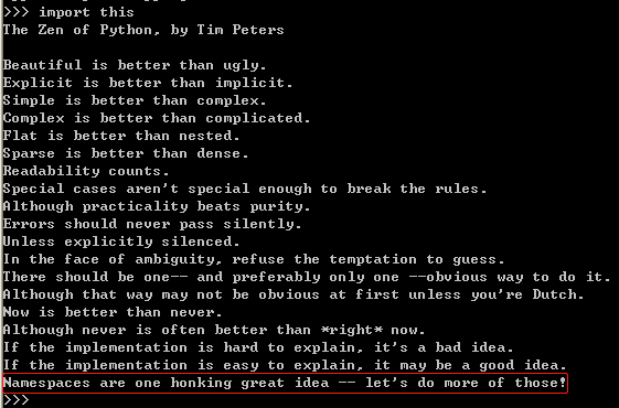 名称空间还方便了大型项目的协作开发,Python之禅中也提到,“名称空间是一个伟大的发明,在日常开发中,我们要尽可能多的使用它。”