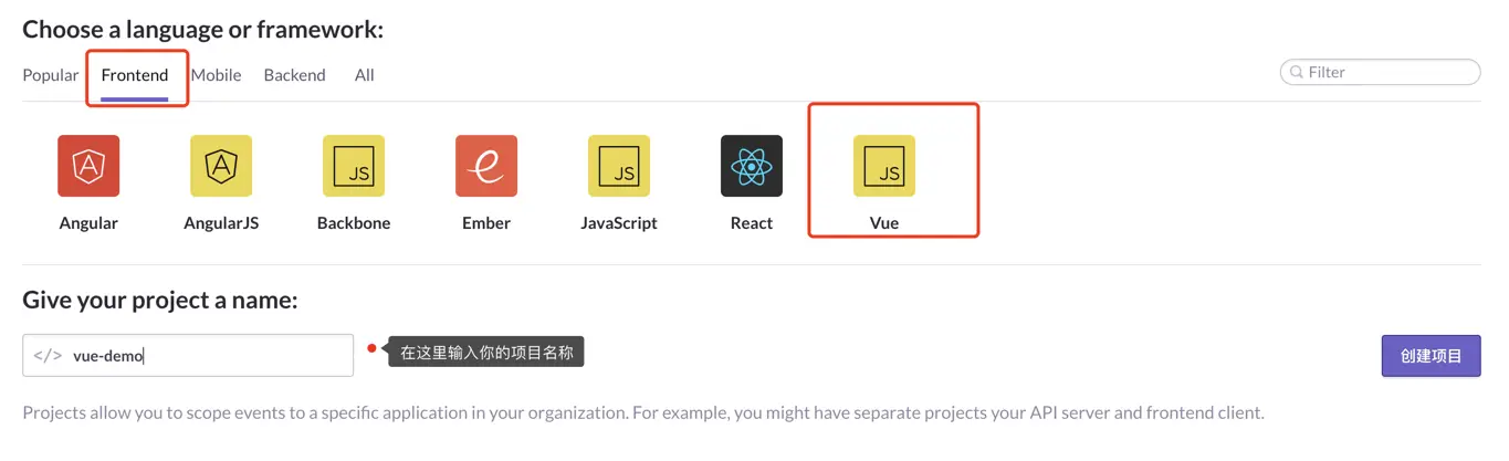 3. 点击新建项目,Sentry是可以支持Vue项目