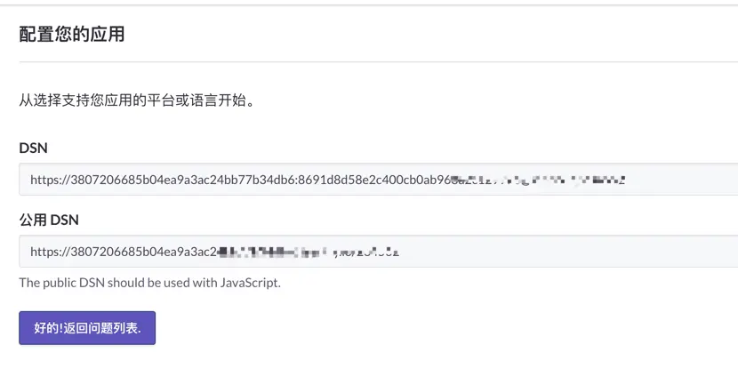 这里的DSN,你就理解成Sentry的给每个项目唯一标识符。它看起来很像一个标准的url,但实际上它只是Sentry的sdks所需配置的表示。它由几个部分组成,包括协议,公钥和密钥,服务器地址和项目标识符。