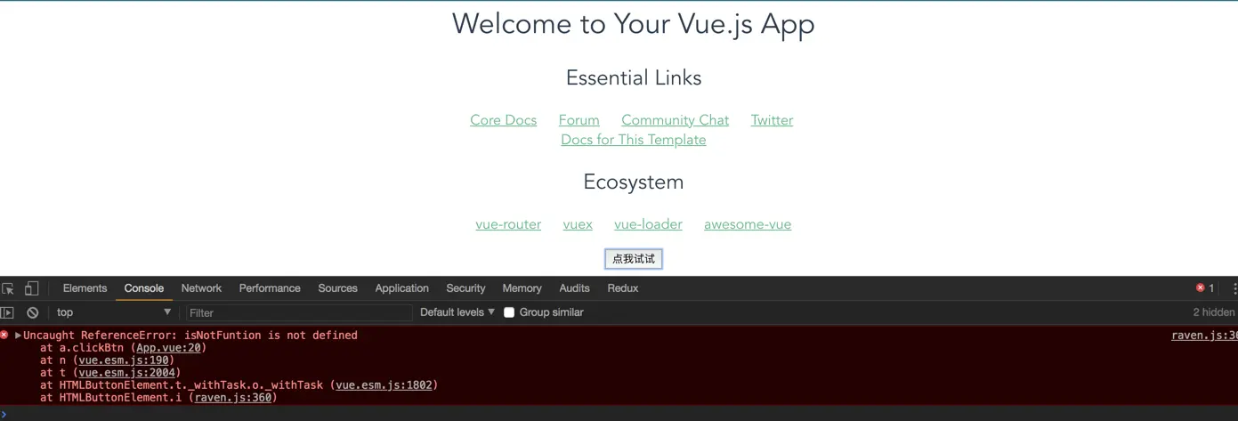 这个时候你打开http://127.0.0.1:6324就能看到刚才我们写的vue项目,然后点击页面上的那个button,果不其然就会报错。这里是因为我们浏览器当你打开调试的时候,默认会去加载sourcemap,Chrome就是这样的,所以你也一样能看到出错的位置的源文件。但是用户不会去打开调试工作台啊。