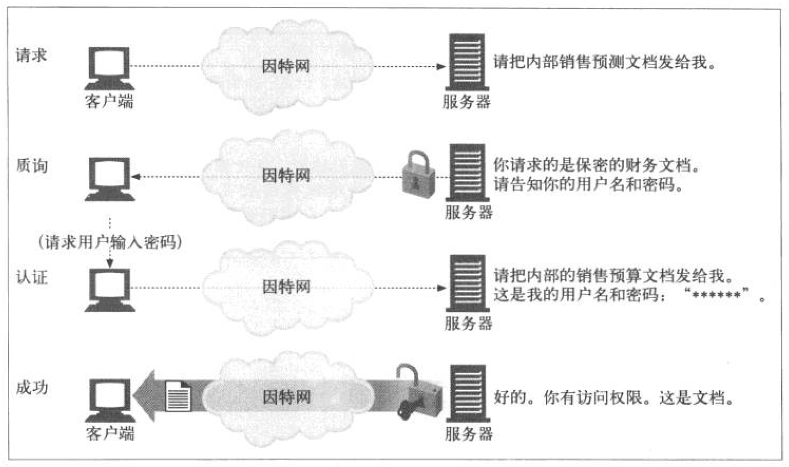 - 在客户端发起HTTP请求时, 服务器并没有直接完成客户端的需求, 而是以"认证质询"的方式响应, 要求客户端提供身份信息.