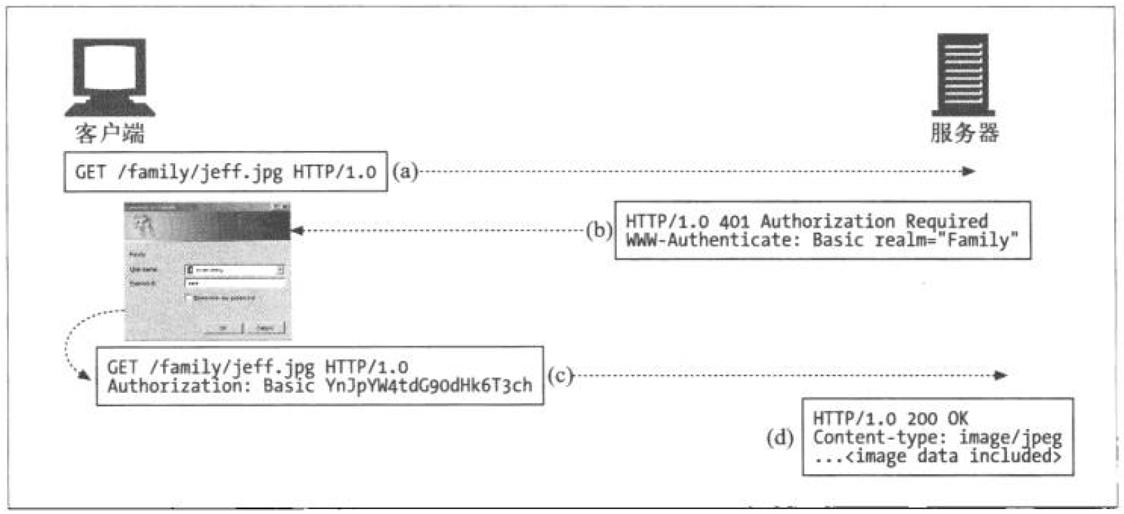 在上述实例的C请求中, 用户名和密码经过Base-64编码之后通过Authorization首部传到服务器. 这里并不是明文传输.更多关于Base-64的说明看这里.当然,这一步的转换并不能保证用户名和密码的安全.