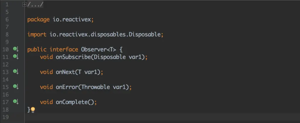如果你和我一样,认为 Subjects 就像是 Observer 和 Observable 的组合,那么请尽量忘掉这个概念。现在我将要修改一下 Observable 和 Observer 的概念. 对于 Observable 我会建议你阅读 Rx Observable 和 开发者 ( 我 ) 之间的对话 [ Android RxJava2 ] (这什么鬼系列 )第五话 并且 Observer 我会建议你阅读 继续 Rx Observable 和 开发者 ( 我 ) 之间的对话 (Observable 求婚 Observer) [ Android RxJava2 ](这什么鬼系列)第七话 。然后你就可以很轻易的理解本篇文章,现在我会在下面和你分享一下 Obsevable 和 Observer 的一些 API。