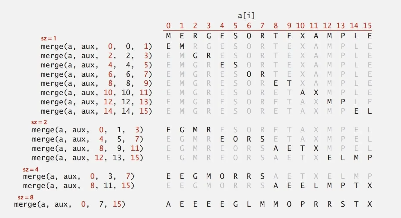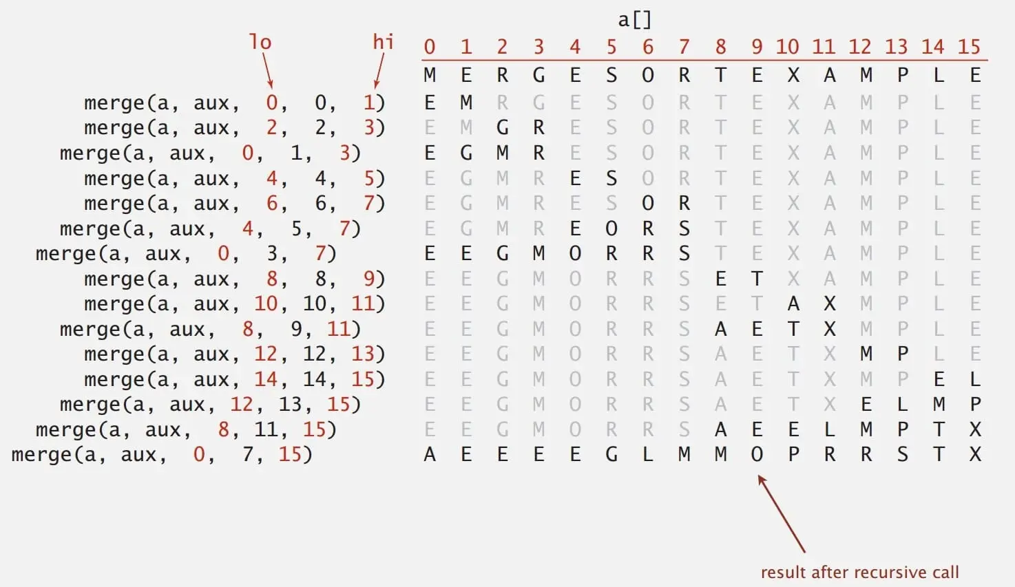 接下来我们看一个 NlogN 级别的排序算法,归并算法。 归并算法正如其名字一样采用归并的方法进行排序: