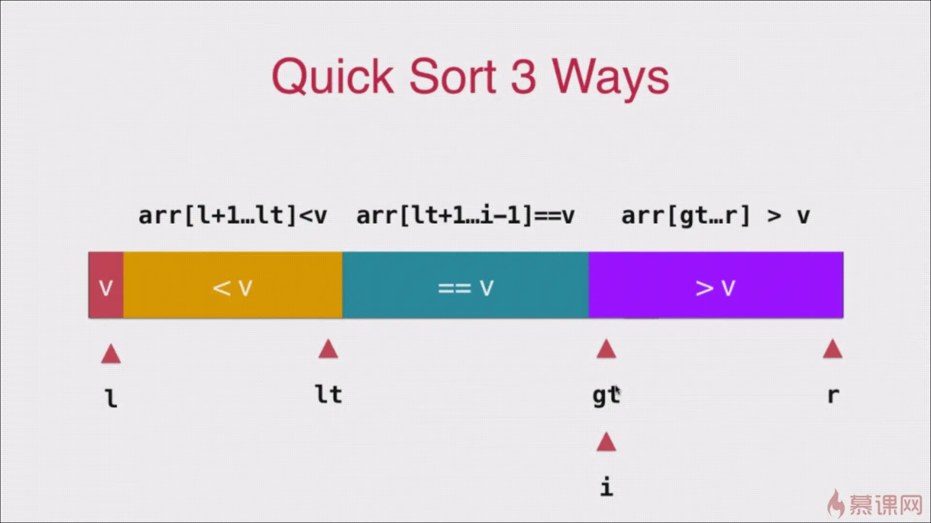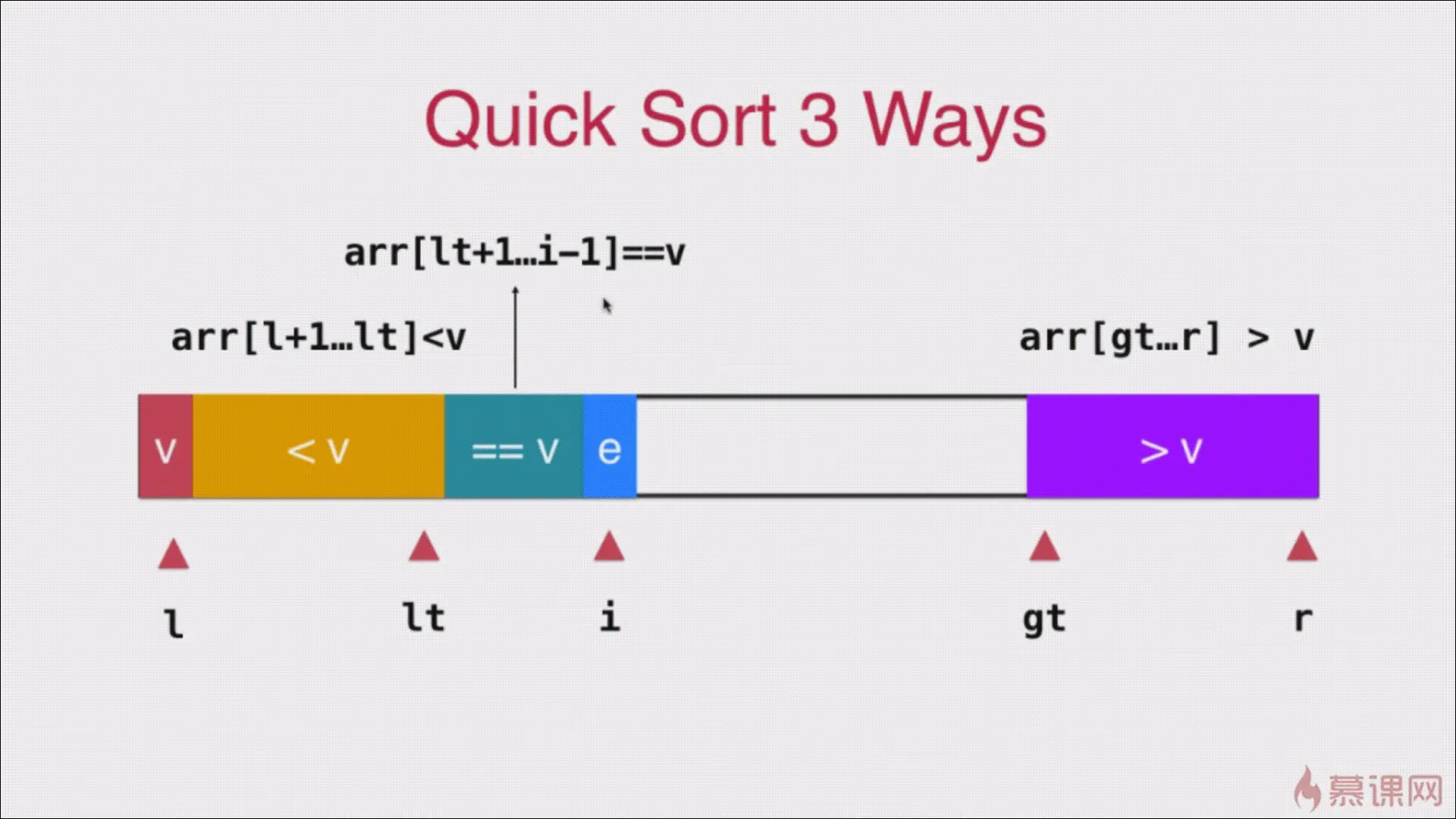 arr[l+1...lt] <v arr[lt+1..i) =v arr[gt...r] > v三部分 其中 lt 指向 < v 的最后一个元素前一个元素,gt 指向>v的第一个元素的前一个元素,i 为当前考察元素 -