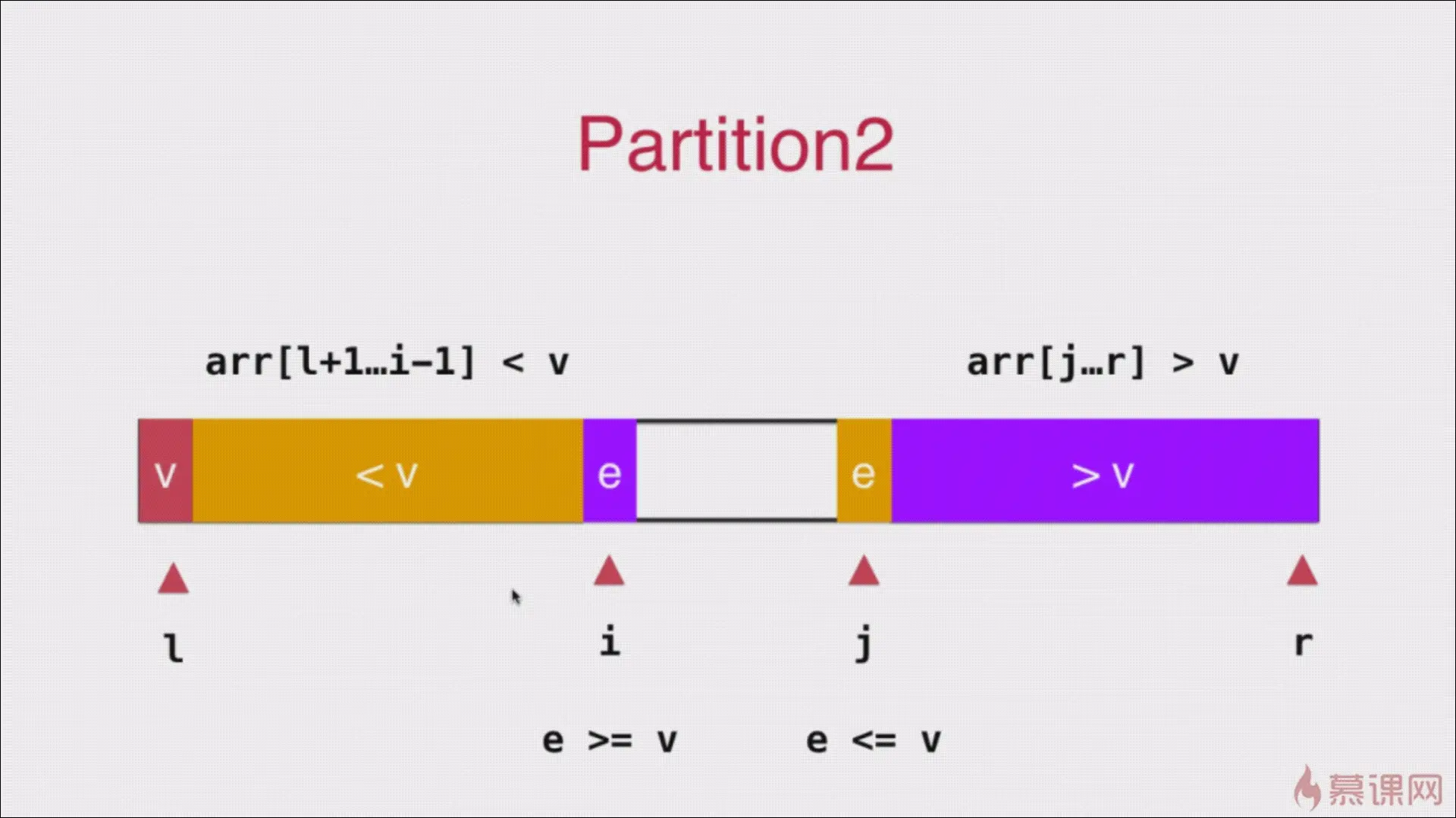 arr[l+1 ... i) <= v, arr(j....r] >= v因此我们可以初始化 i = l+1 以保证左侧区间初始为空,j = r 保证右侧空间为空 -