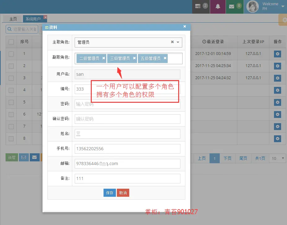 . 系统用户:对各个基本的用户增删改查,单发、群发站内信邮件短信,导入导出excel表格,批量删除