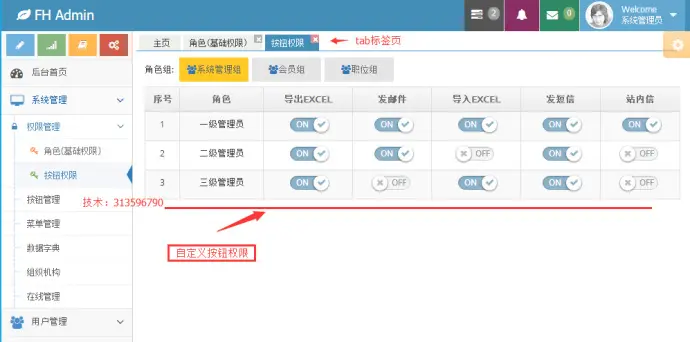 . 按钮管理:自定义按钮管理,维护按钮权限标识等