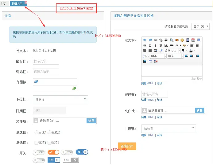 . 表单构建:拖拽式快速自定义构建表单,组建元素丰富,有富文本、上传控件、下拉框等等