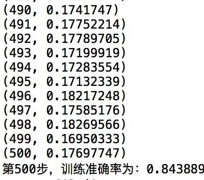 执行结果,笔者在大概500次训练后,得到准确率84.3%的结果