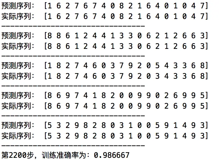 大概训练1500~2200次左右,准确率就能达到98%,打印前5条测试样本可以看出,输出结果基本与label一致了