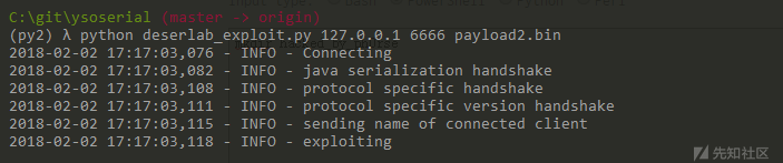 使用deserlab_exploit.py脚本【上传到自己的github gist页面上】生成payload:python deserlab_exploit.py 127.0.0.1 6666 payload2.bin PS:注意使用py2.7