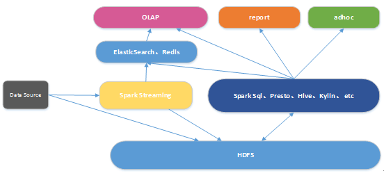 图1为携程大数据平台架构图,DataSource为不同的数据源,有日志信息、订单信息。它们通过携程自己研发的中间件或者直接落地到HDFS或者被Spark Streaming消费之后再落地到HDFS。
