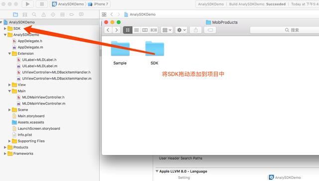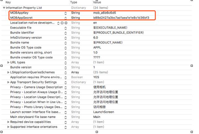3.从上述步骤申请并获取所得的AppKey, AppSecret,请在项目的Info.plist中分别添加’MOBAppKey’, ‘MOBAppSecret’此两字段并分别对应填入,如图