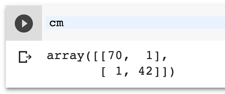 上面的数字表示:70个正确的否定预测,1个错误的肯定预测,1个错误的否定预测,42个正确的肯定预测。