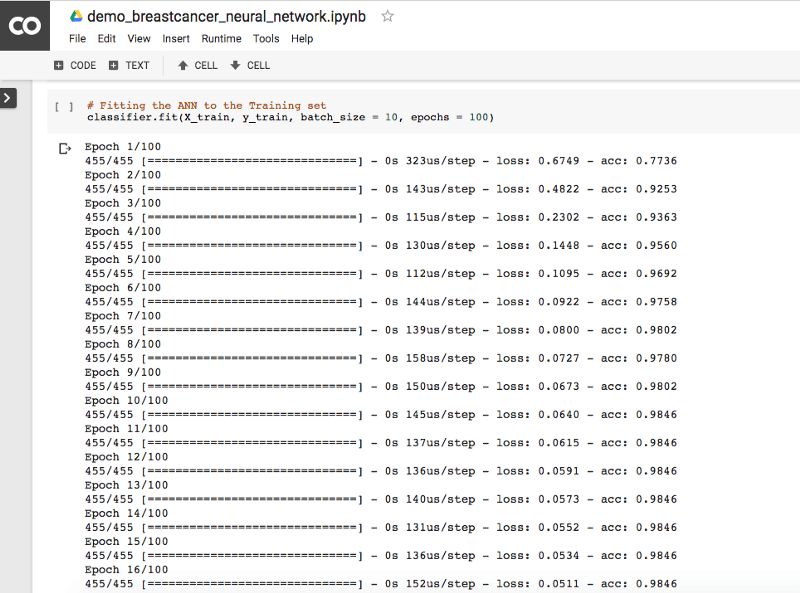 下面我将通过一个例子演示如何使用Colaboratory训练神经网络。我们将在UCI机器学习仓库提供的威斯康星州乳腺癌数据库上训练一个神经网络。