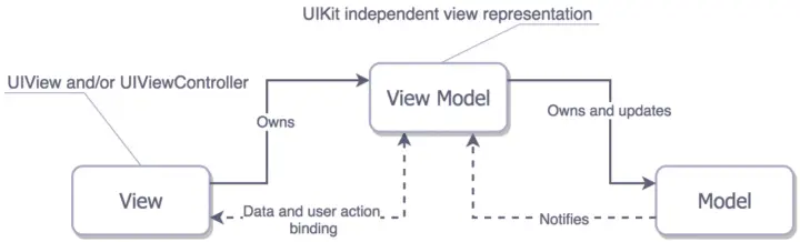 - 相比较MVC,View/ViewController不直接引用Model,而是通过ViewModel,ViewModel负责用户交互逻辑,视图显示逻辑,发起网络请求等