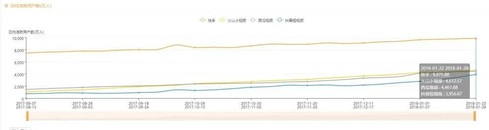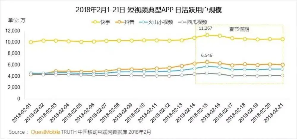 从QuestMobile的数据来看,快手从2017年到2018年春节增长了7000多万DAU,这还是在4000万DAU的基础之上的。